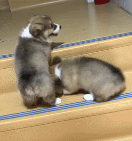 兩只柯基寶寶上樓梯,其中一只看同伴上不上去,就立馬趴下當(dāng)墊腳石...